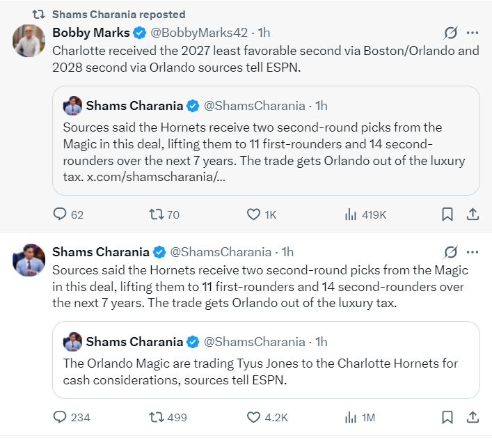 根据鲍比-马克斯的说法,黄蜂从魔术方面获得的两个次轮签,一个是2027年绿凯/魔术靠前的那个,一个是魔术2028年次轮签。